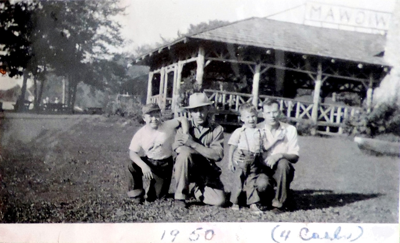 From left to right: Carl William Holm, his father Carl Johan Holm, Carl David Holm, and his father Carl Gustav Holm. Carl Johan is Carl Gustavs uncle. They are at Pentoga Park in front of the Wigwam pavilion. There appears to be the prow of a dugout canoe on the right side of the photo.
