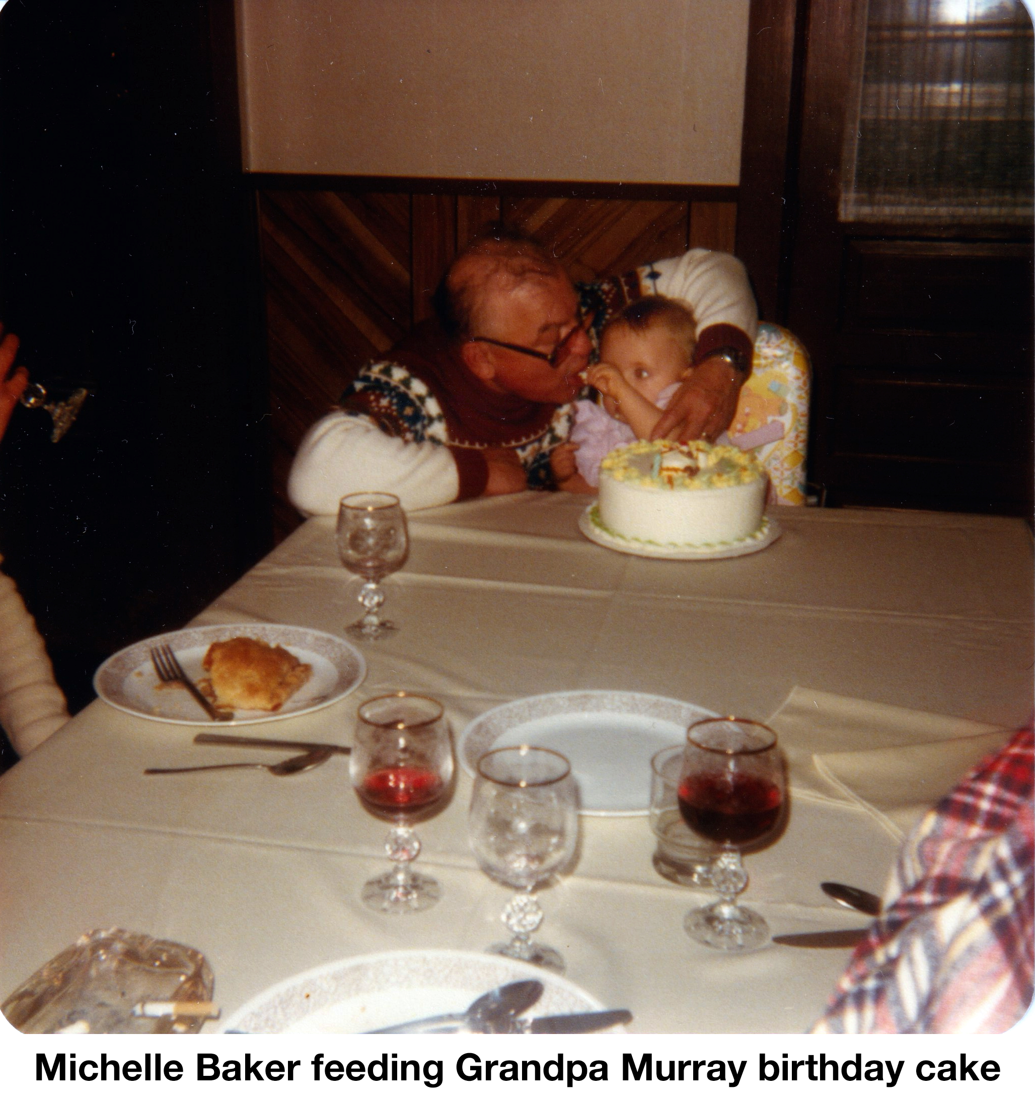 There are two photos on this page. The first shows Jim Curt and Lori Baker celebrating their daughter Michelles first birthday in December 1979. The second shows Michelle feeding cake to her grandfather Murray. Michelle and Murray share the same birthday.