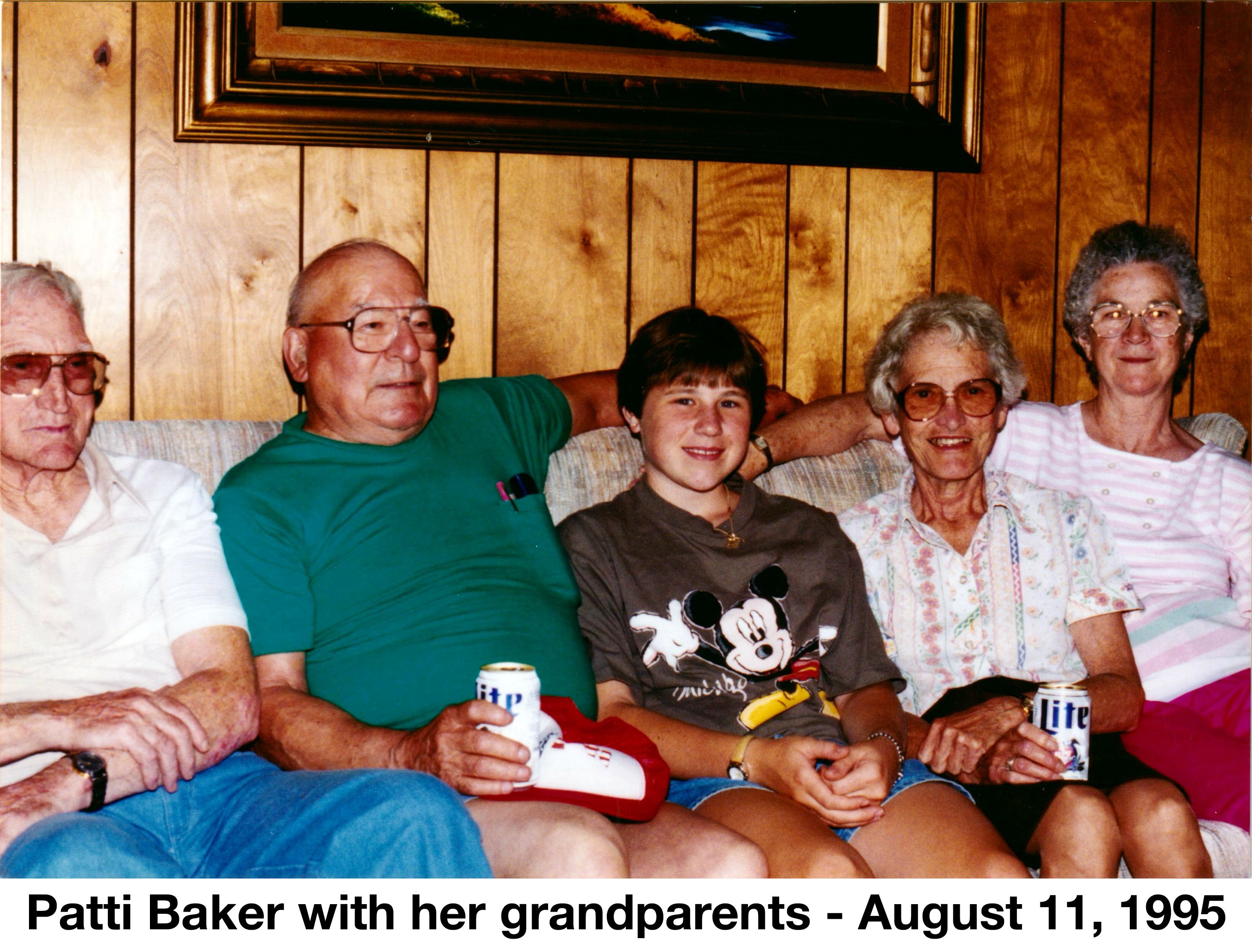 Patti Baker, John and Sherrys daughter, visiting with her grandparents on August 11, 1995. . From the left, Walter Clements, Murray baker, Patti, Helen Holm Baker, and Beth Clements. They were at the Clements home in LAnse, Michigan.