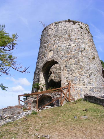 Ruins of the windmill at the sugar mill Leinster Bay with Waterlemon Cay, and in the background, Little Thatch Island and Tortola in the British Virgin Islands