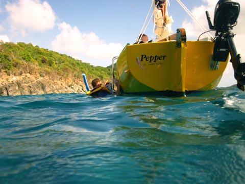 A stand of pillar coral A snorkeler climbing aboard the sloop Pepper at Whistling Cay