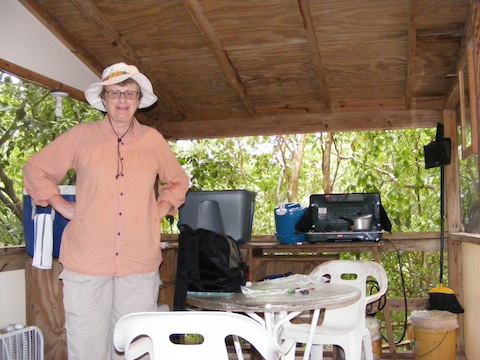 West end of Little Maho beach, with some cabins visible among the trees Gail in the kitchen area of our tent-cottage