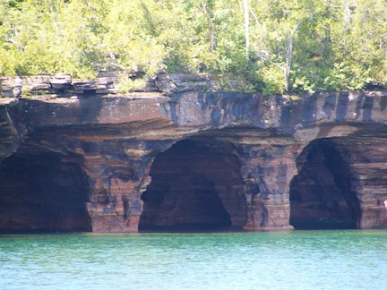 Having had very little exercise for three weeks, we wanted to hike the trails in the lakeshore. We didn't succeed in this because the mainland trail was ankle deep in mud following a heavy storm and because we missed the day on which a boat would take us to Stockton Island, where there also were trails. We did take the grand tour boat ride around the islands. We saw several of the islands' lighthouses and, on Devils Island, spectacular sea caves.