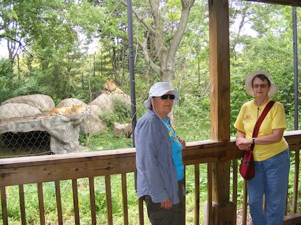 | Gail and Maija in front of the zoo's new lion cub and his parents |