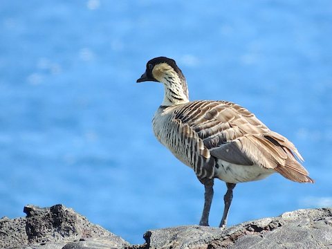 A Nene, the state bird of Hawaiʻi, standing on a lava cliff above the Pacific Ocean in Hawai'i Volcanoes National Park |