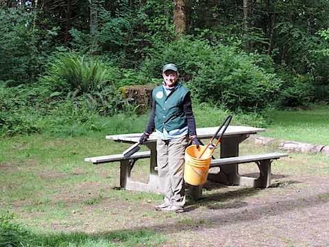 A camp host before us set up a hummingbird feeder and left us a jar full of sugar water, a recipe for more and instructions to "Enjoy". Well, these are voracious little creatures, feeding from 6 in the morning until 9 at night. To keep them satisfied, we were refilling the feeder morning and night. It was a big responsibility! A beautiful day here starts off overcast, chilly and with a feeling of mist in the air. It stays like that all morning, but in the early afternoon the clouds burn off, the sky turns blue and the the day becomes warm. During our first 10 days here, that became our expectation of how every day is. Then a week of rainy weather with highs in the mid 50s followed. We were excited when better weather returned, but our experience of the first 10 days was never duplicated. We kept up with the news via WNPR station KSWS FM 88.9 from Chehalis. As camp hosts, we greeted campers, sold them bundles of firewood, solved minor problems, completed odd jobs, but mostly cleaned the campsites after campers left and before others arrived. One evening Al gave a tour of constellations and stars in the night sky to about 20 campers. |