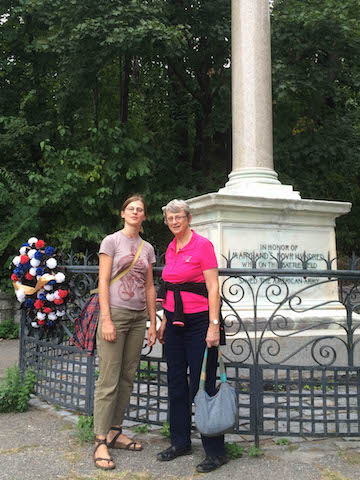 Gail and I visited CJ in New York. After driving from Maryland on Friday, we checked into the Days Inn and, arriving at 2 PM, were lucky to get one of the hotel's six parking spaces. We took the B35 bus to CJ's, leaving our car comfortably parked. She took us on a hike to Prospect Park and the monument there in honor of the company of Maryland soldiers who held off a British attack, allowing George Washington and his soldiers to escape. We also met Niko, CJ's roommate's cat.