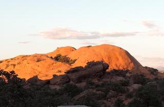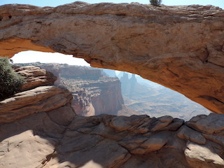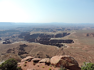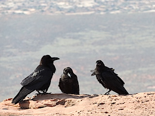 The panorama above shows some of the view from the point. The brown-colored Colorado River, bordered by green trees, is visible at several locations. This is desert up here at 6,000 feet. The pinyon pine and Utah juniper provide very little shade. Canyonlands National Park is located on the same plateau, several miles to the southwest. Arches National Park is lower in elevation, about 15 miles to the northeast as the raven flies. Ravens were our buddies. They were talkative, social, and almost always around. Our only conflict with them was that they wanted to eat our garbage and we wanted to keep them from littering the park. Lizards, cottontail rabbits, violet-green swallows, and black-throated sparrows are also common in the park, and we even saw a few kit foxes. Once again, we volunteered at a state park in order to spend time in an area we wanted to learn about. And, as we did in Washington state last year, we worked as camp hosts. |