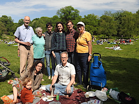 CJ quickly hustled us along to Prospect Park, where her friend Elena was having a picnic in celebration of Elena's upcoming graduation with a Masters, also from Hunter College but in Social Work. There we met other members of the Brooklyn Friends Meeting, which both CJ and Elena attend. Elena is also a Sandy Spring Friends School alum, but more recently than CJ. From the picnic, we went to the Park Slope Food Co-op for supplies for CJs Memorial Day picnic, back to CJs apartment to store the supplies, to Wheated Restaurant for a pizza dinner, and finally into Manhattan for Contra dancing. Gail and I had missed the dance lesson and had already walked nearly five miles so we sat this one out. We did enjoying watching the swirling motion and listening to the live musicians. |