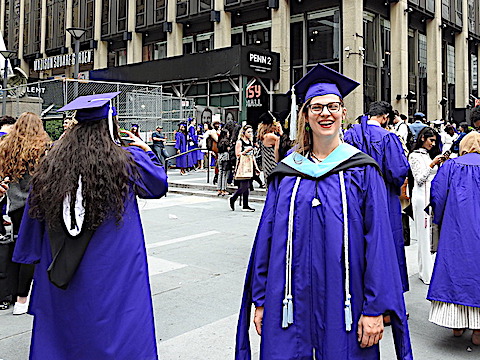 We met with CJ again at the D train station and took the train to Manhattan for the ceremony at Hunter College. This was followed by a reception for the master's students in the Lincoln Center program. We came out to heavy rain and eventually a thunder storm, but we managed to get to The Farm for a celebratory meal.
