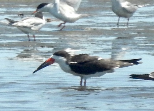 What is the difference between the wildlife refuge in April and it in July? Insects! Multitudes of blood seeking insects! We found them, and they us, along the Boardwalk Loop Trail. They were especially bad at the little family cemetery where we'd been told that a Yellow-breasted Chat hangs out. It wasnt pretty, but we did escape. The bites stll itch half a week later, Later we walked the dike trail into the middle of the ponds. There was much less vegetation and more breeze that kept the insects in check. From a viewing platform at the end of the dike, we saw a variety of gulls, terns, and shorebirds, and great blue herons and osprey. A big surprise to me was finding that there were two Black Skimmers among the gulls and terns on the mud bank near the viewing platform. These birds are relatives of the terns. They have a long lower beak, which they stick in the water as they fly just above the surface to catch small fish. I did not make this video, but it shows how the Black Skimmers feed. |