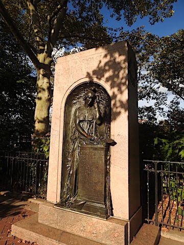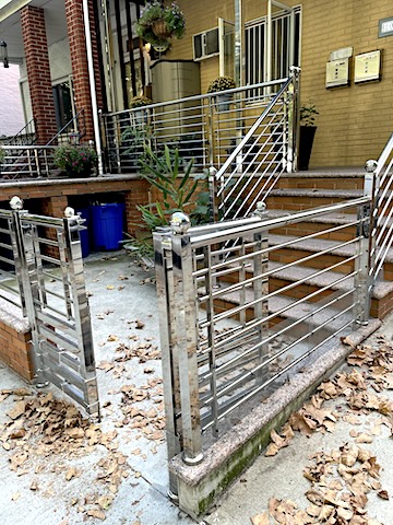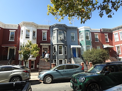 Saturday morning we stopped for coffee at the Steplechaise Coffee Shop, which was just around the corner on Fort Hamilton Parkway from the apartment. We arrived at 7 AM. The shop did not open until 7:30, but the woman inside kindly sold us coffee and even a breakfast cake. We ate sitting on a sidewalk bench in front of the shop. While we ate, pigeons gobbled up acorns on the sidewalk near us and lined up in the sunlight at the top of the buildings.