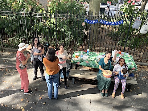 CJ held the birthday party on Saturday morning at the Greenwood Playground, which is located between East 5th Street and the Prospect Expressway. The first event was a breakfast of bagels, tangerines, and cut melon. The food attracted some yellowjackets, but no one was stung.