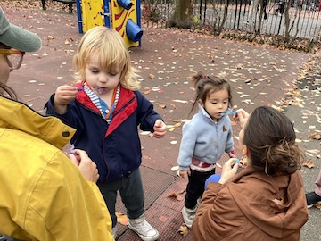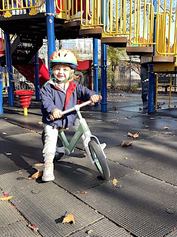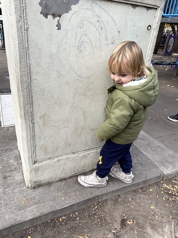 We traveled by Amtrak to get the experience. If I remember correctly, the last time we went by train was over two decades ago when we attended a dance program at Hampshire College in the winter. This time we boarded at the BWI Amtrak station and got off in Manhattans Penn Station. We got on near the middle of the train and found no seats together in that car. We went to the next car back and found no empty seats. Back in the first car, a man sitting across from his family moved ahead of them so we could sit together. Our arrival in New York was delayed when the train had to wait in the New Jersey wilderness due to track work going into Manhattan. We exited the train through the lower level of Penn Station, the Long Island Rail Road Concourse, past a line of fast food shops. From there, we walked a short distance to the subway station at the intersection of 34th Street and 6th Anvenue. Then we took the Q Train all the way to Cortelyou Road, just over a block from the AirBnb where we would sleep. We stayed in the same AirBnB apartment where we stayed during our visit for Morgans birthday in September. After we arrived, we joined CJ and two of her colleagues for a beer. Then CJ got Morgan from the day care and we started our main focus of the weekend, visiting playgrounds with Morgan.