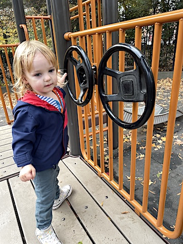 A ships captain at the helm of a huge vessel at Vanderbilt Playground in Prospect Park |