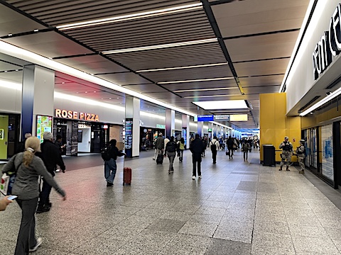 Monday morning, we retraced Fridays path: the Q Train from Cortelyou to Herald Square; a short walk to Penn Station; and then Amtrak to the BWI Station. Once again, in Penn Station, we passed the line of fast food places in the Long Island Rail Road Concourse. Notice the National Guard soldiers near the right edge of the photo. The Guard was deployed here by New Yorks governor in 2024 to help keep weapons out of the transit trains.