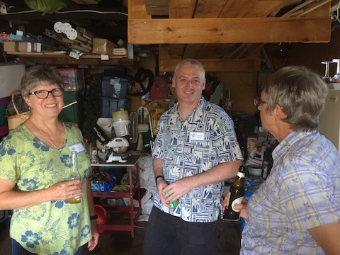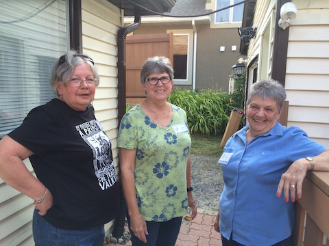 Since this was the first time many of us had met, the first event of our reunion was a Meet & Greet on Friday evening kindly hosted by Vicki at her home. Her uncle Joe fried pickerel that was delicious and there was plenty of other food to enjoy. Sharon, one of the chief organizers of the reunion, had broken her knee in a fall just weeks earlier, but was able to attend this event despite the pain.