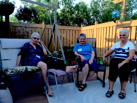 Since this was the first time many of us had met, the first event of our reunion was a Meet & Greet on Friday evening kindly hosted by Vicki at her home. Her uncle Joe fried pickerel that was delicious and there was plenty of other food to enjoy. Sharon, one of the chief organizers of the reunion, had broken her knee in a fall just weeks earlier, but was able to attend this event despite the pain.
