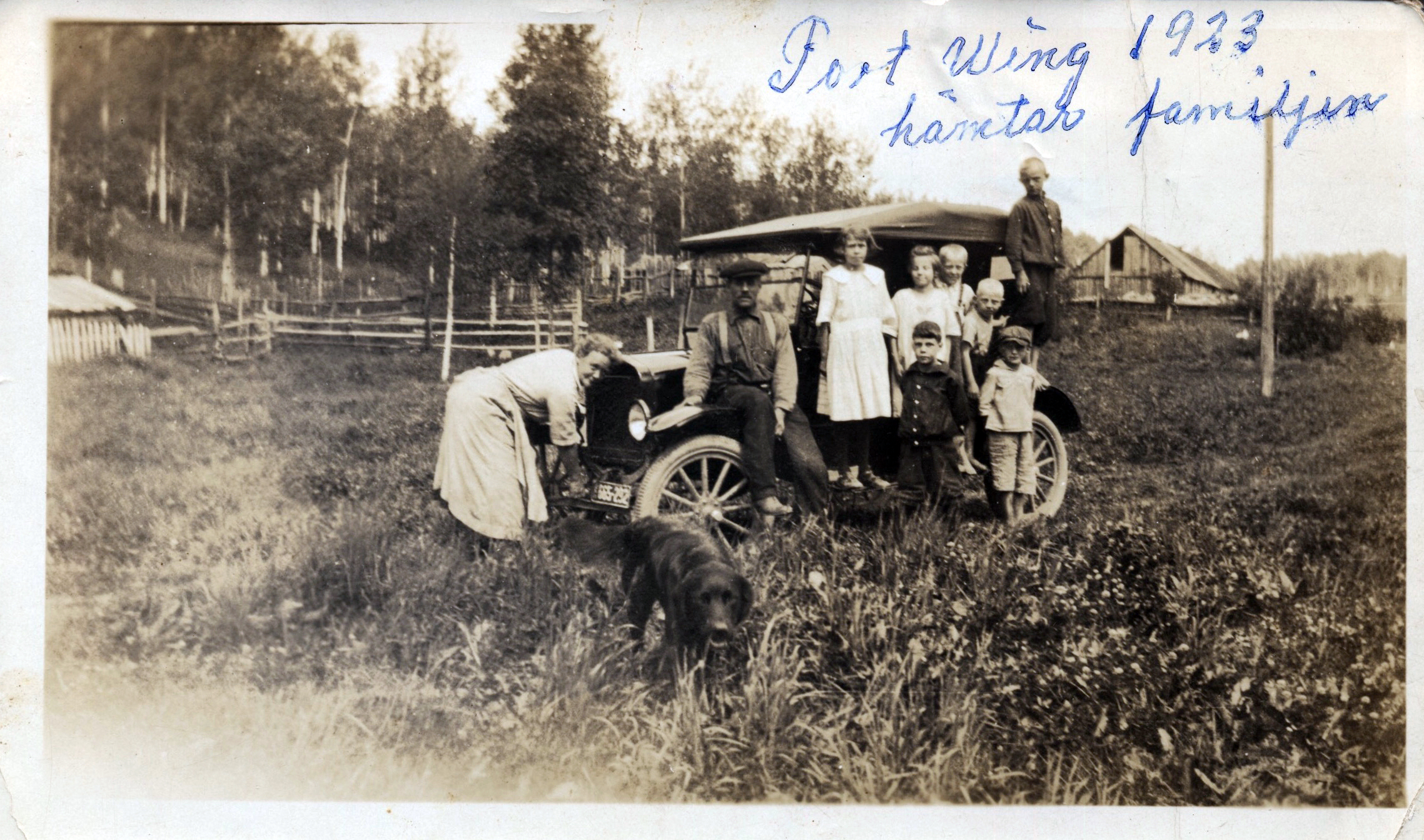 Victor Holm labelled this photo Port Wing / Cares for the family. I think that is Victor sitting on the fender and his son Carl in the dark shirt. The tallest girl might be Aunt Aurora. I don't recognize the other people. The woman with her hand on the crank does not look like Frida. The black dog could be the Holm family dog named Nigger. The car appears to be a 1923 Ford Model T Touring. In her little memoir, Aurora Hovey wrote I will never for get the day [my father] came to take the family to our new home. He had a brand new 1923 Model T Ford with side curtains, running boards, luggage carrier, and we thought it was the most beautiful car in the world. Well, we all piled in...a big dog, four kids, and mother and dad. We had 200 miles to go, and it took us 12 hours to make that trip. Is this photo of that car? It appears to be the same year and model. However, there is no luggage carrier.
