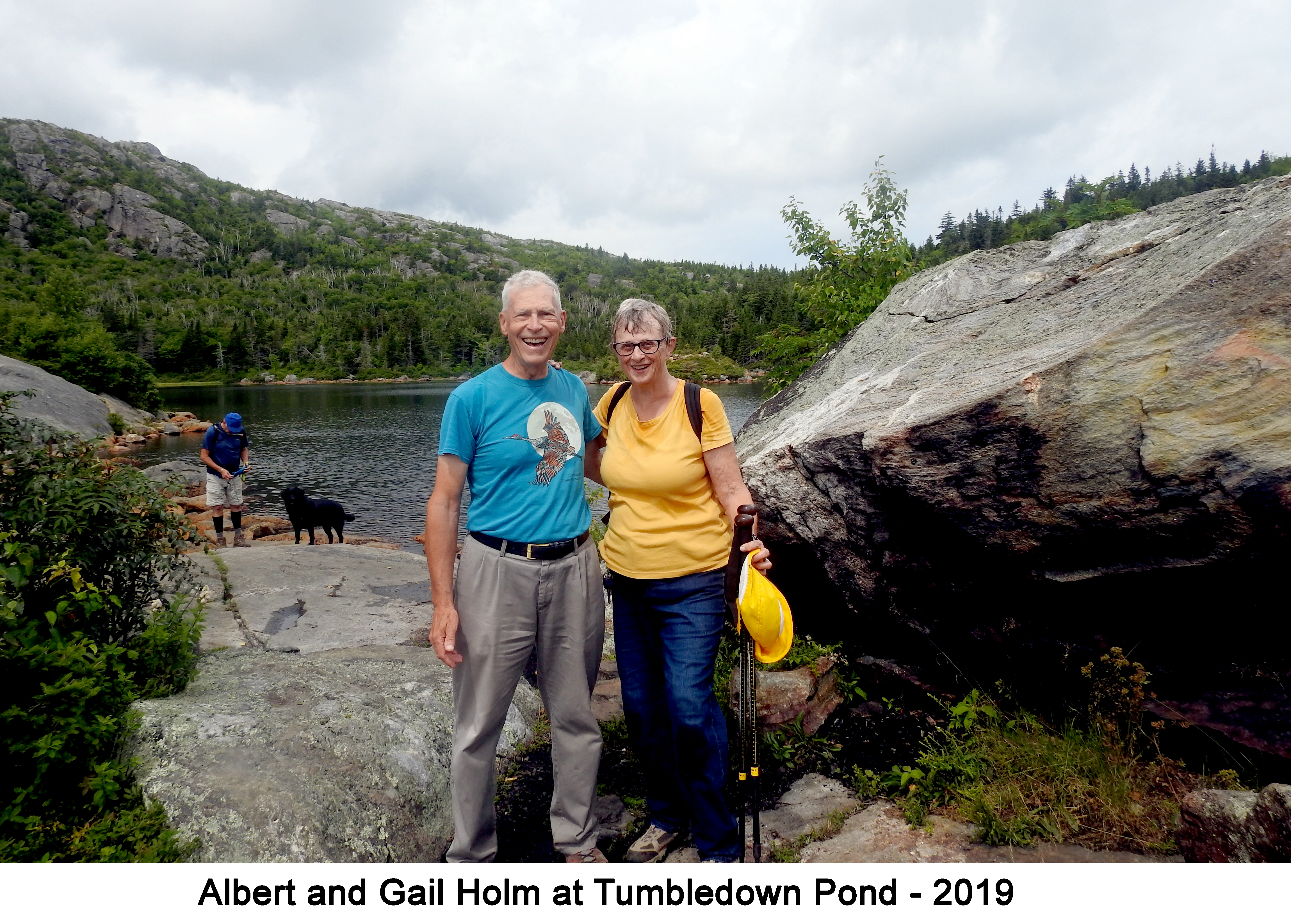 Albert and Gail Holm at Tumbledown Pond in Mount Blue State Park in Maine in August 2019. We had hiked and scrambled up over 1,400 feet to reach this little lake. We were on a weekend side trip we made while volunteering for two months as campground hosts at Lake St. George State Park, also in Maine. Click here see more images of our summer travels in Maine