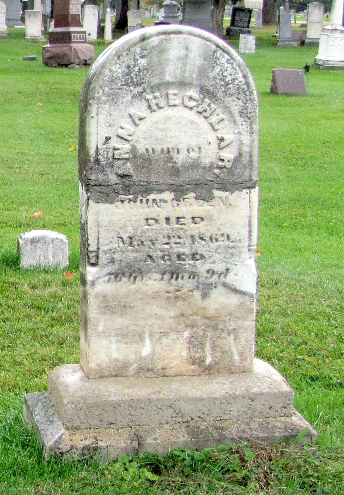This is the headstone for Anna Hechlar Green in the Marengo City Cemetery in Illinois. Her actual maiden name was Hetzler. Apparently, her children misheard the name as Hechlar. She is buried here with two infant children: John who was born 14 Feb 1844 and died 31 Mar 1845; and Anna who was born 11 Oct 1848 and died 22 Jan 1850. Her daughter Elizabeth Green Kennedy is also buried there with her husband John Kennedy.