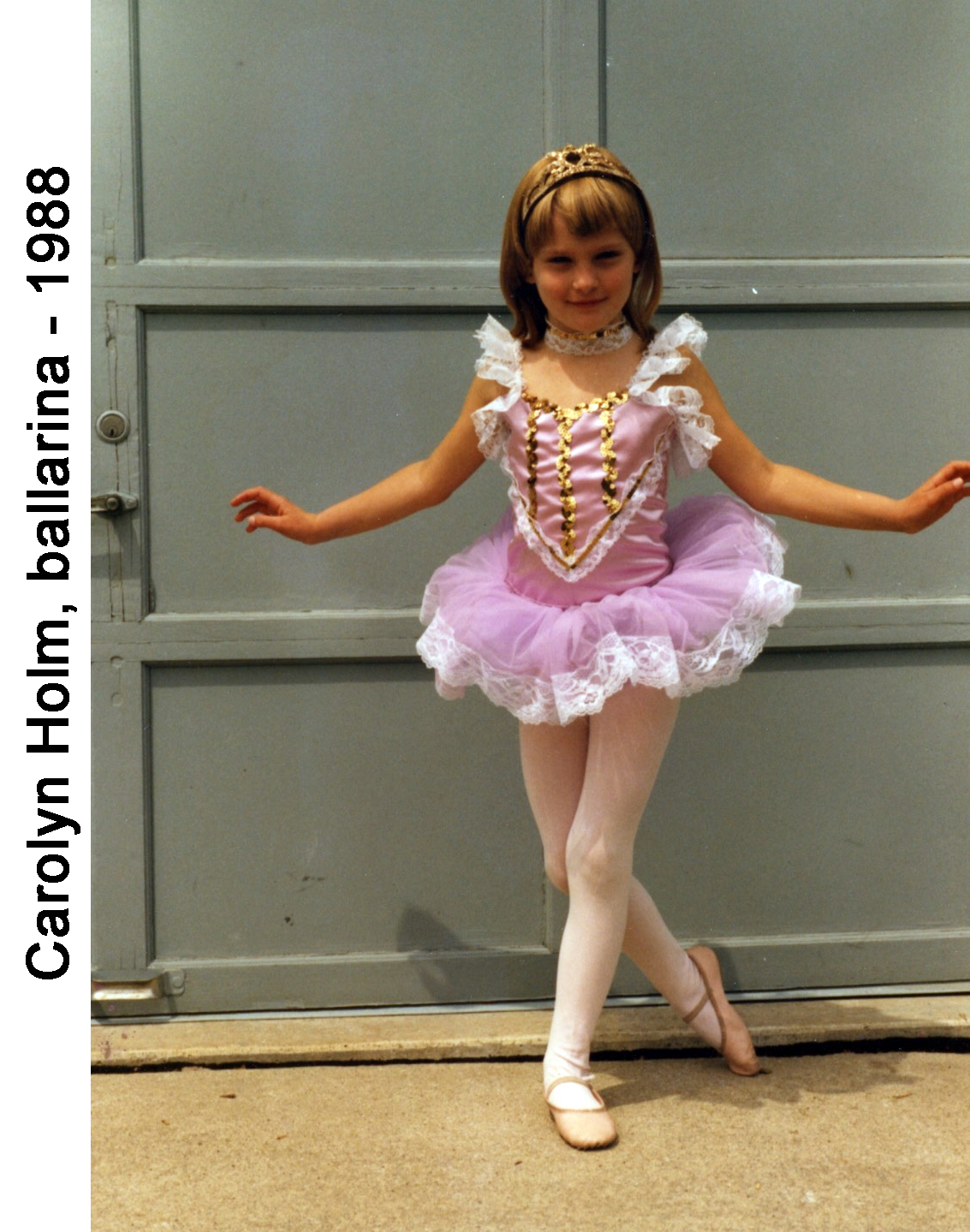 Carolyn Holm posing in her ballarina costume in front of our garage doors in summer 1988.