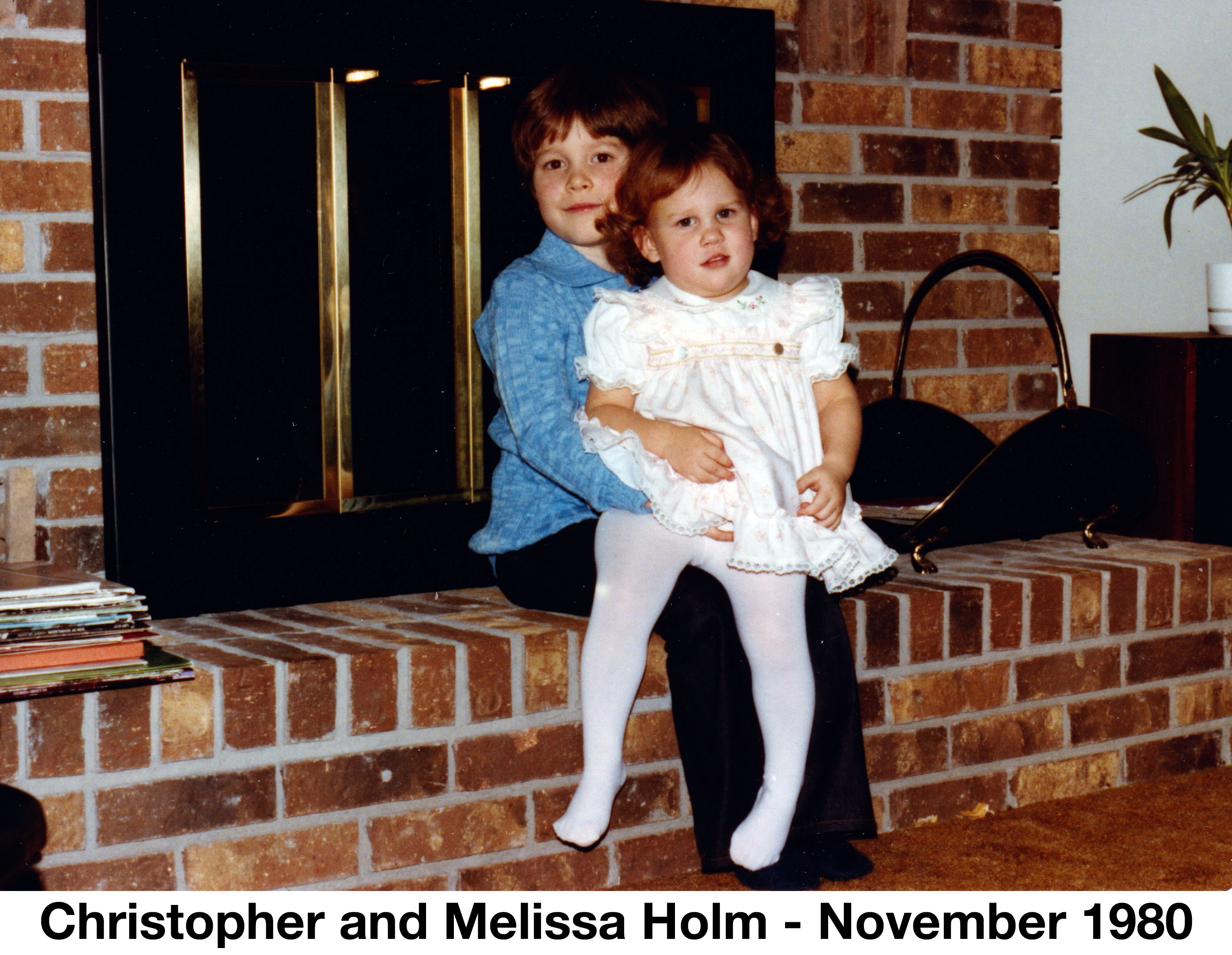 Chris Holm holding his sister Melissa on November 1980. They are sitting on the fireplace at their grandparents home.