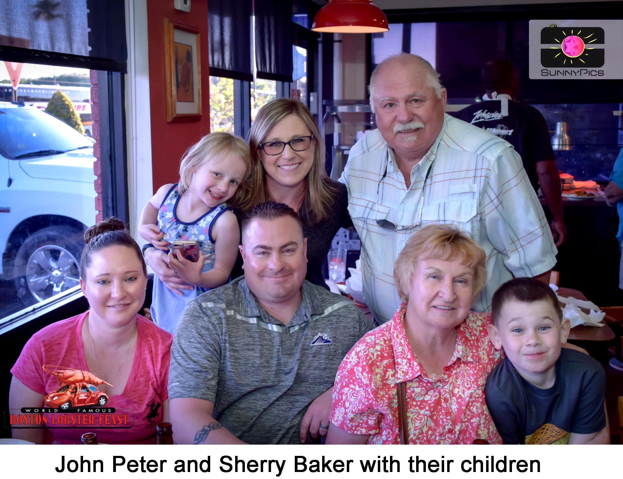 John Peter and Sherry Baker with their daughter Patti and her children Robert & Nichole, and with their son Jeffery and his wife Stephanie in April 2019. Nichole, Patti, and Pete are standing, and Stephanie, Jeff, Sherry, and Robert are sitting.