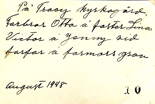Victor and Jenny Holm with his uncle Otto Holm and Ottos wife Lina in August 1948. They are at the location of the grave of Victors grandparents and Ottos parents, Olof Andersson and Eva Andersdotter, in Tracy, Minnesota.