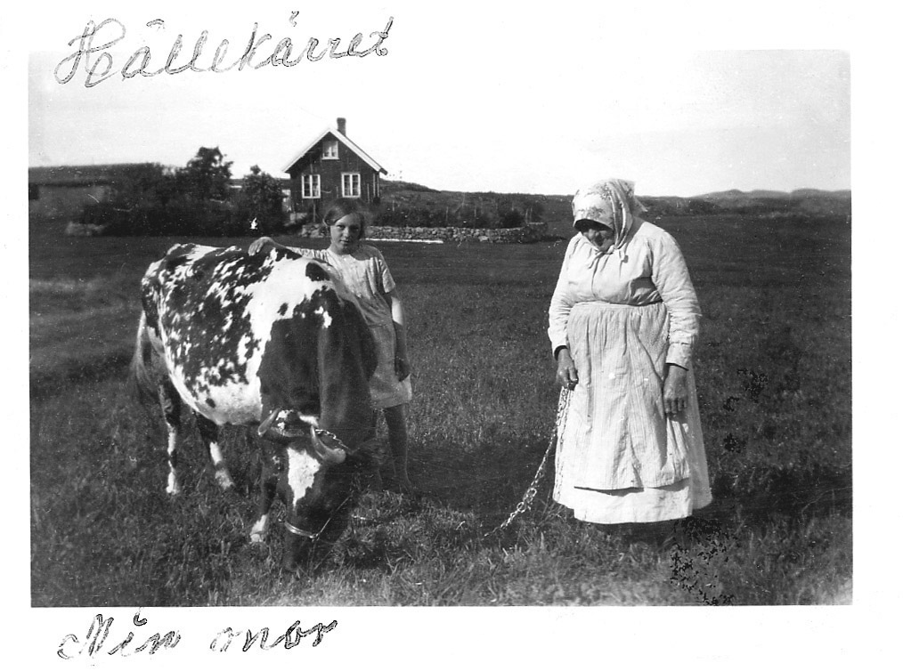 Victor's mother, Adela Olafsson, at Hällekårret in Sweden. The girl by the cow is Margaret Peggy Carlson, Adelas granddaughter and the daughter of Alida Olofssdotter Schevenius/Carlson. Hällekårret was the farm they moved to after leaving Häljebo.