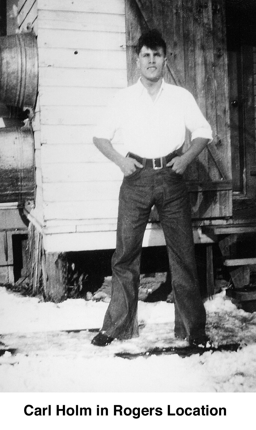 Carl Holm in front of the house at Rogers Location. There appear to be laundry tubs hanging from the left side of the house