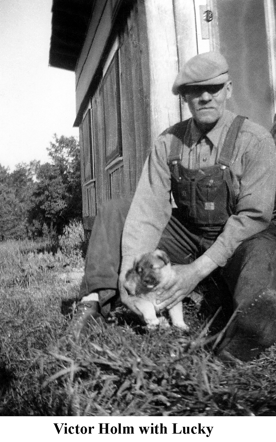 Victor Holm holding the German shepherd puppy Lucky. The picture was taken at his chicken coop.