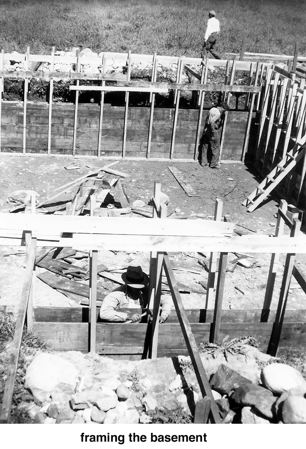 Framing a basement in preparation for the pouring of concrete. This probably is Victors home on Passamani Road. The person in the foreground in a shadow may be Victor Holm and that may be Carl by the back wall.
