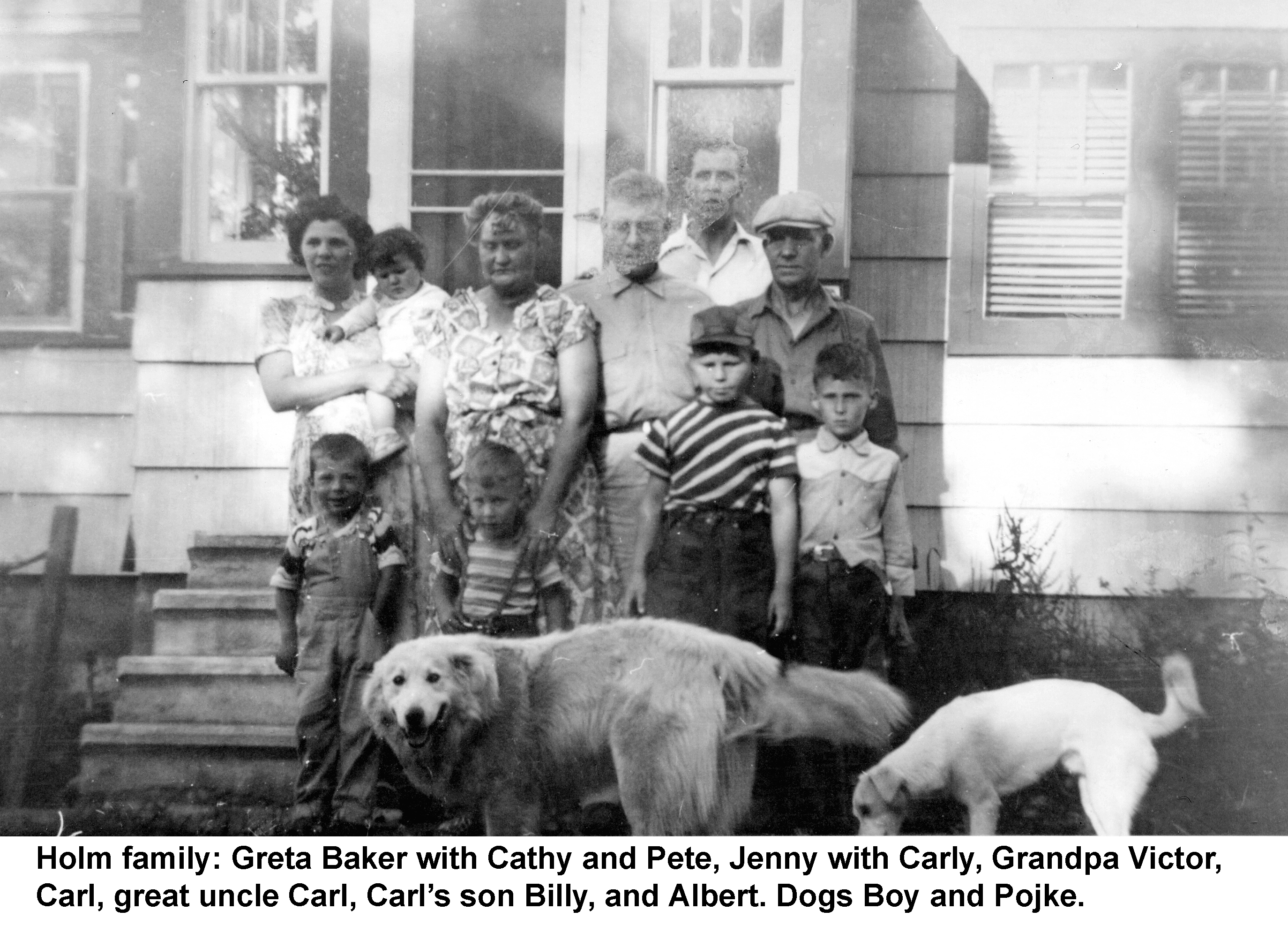Brothers Victor and Karl Holm with some of their families. From the left, Victors daughter Greta Baker holding Cathy, John Peter Baker, Victors wife Jenny with grandson Carl, Victor Holm, Victors son Carl, Karls son Billy, Karl Holm, and Victors grandson Albert. The dogs are Boy and Pojke, which is Swedish for Boy.