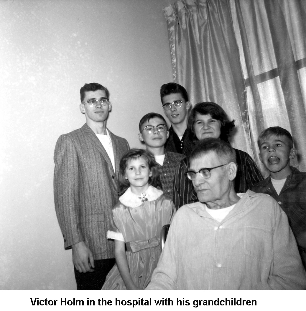 Victor Holm in the medicare facility at Crystal Falls with his grandchildren. From the left are Albert Holm, Terri Lee Holm, John Peter Baker, Carl Holm, Cathy Baker, and James Curtis Baker.