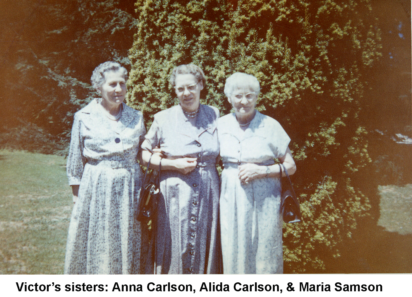 These are Victor Holms sisters: Anna Carlson, Alida Carlson, and Maria Samson. The second photo was taken at the same location, but Alidas grandson, Brad Holway, has replaced her.