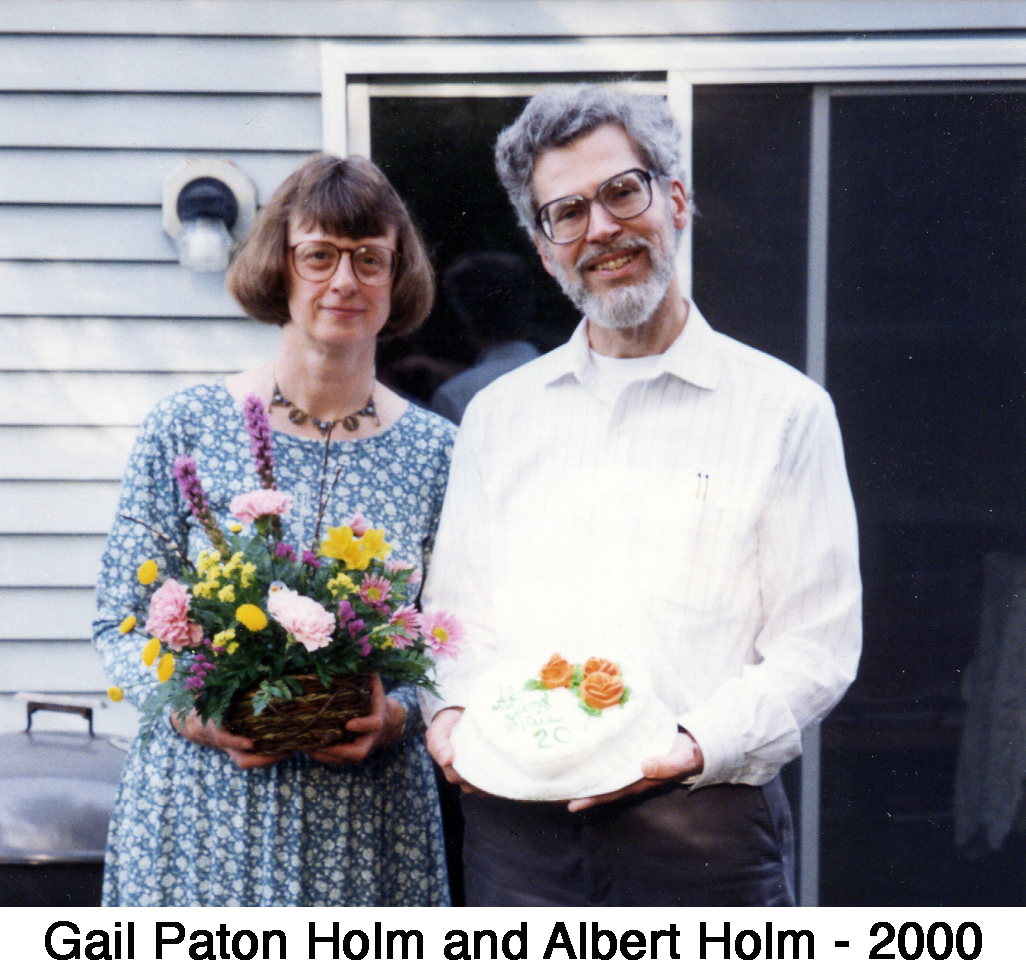 Gail Paton and Albert Holm celebrating their 25th anniversary with flowers and a cake.