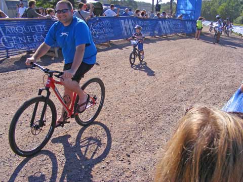 After lunch we visited with Carl and Ruth Ann, with nephew Chris and April, and with their boys. The boys were participating in the children's events of the Ore to Shore bike race. It was Caden's 8th birthday and he competed in the 4-mile, 8-and-9-year-old section of the Junior Rock race. Griffen participated in the Little Rock one-mile ride. Surprisingly, this day was one of the hottest of our trip. Usually Marquette is cool.