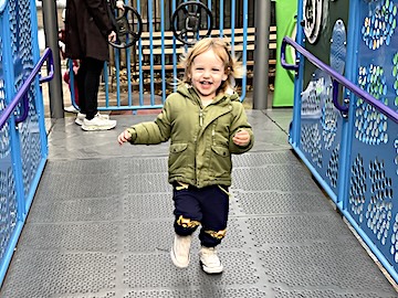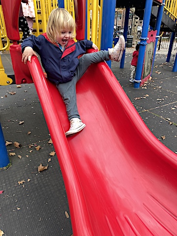 We traveled by Amtrak to get the experience. If I remember correctly, the last time we went by train was over two decades ago when we attended a dance program at Hampshire College in the winter. This time we boarded at the BWI Amtrak station and got off in Manhattans Penn Station. We got on near the middle of the train and found no seats together in that car. We went to the next car back and found no empty seats. Back in the first car, a man sitting across from his family moved ahead of them so we could sit together. Our arrival in New York was delayed when the train had to wait in the New Jersey wilderness due to track work going into Manhattan. We exited the train through the lower level of Penn Station, the Long Island Rail Road Concourse, past a line of fast food shops. From there, we walked a short distance to the subway station at the intersection of 34th Street and 6th Anvenue. Then we took the Q Train all the way to Cortelyou Road, just over a block from the AirBnb where we would sleep. We stayed in the same AirBnB apartment where we stayed during our visit for Morgans birthday in September. After we arrived, we joined CJ and two of her colleagues for a beer. Then CJ got Morgan from the day care and we started our main focus of the weekend, visiting playgrounds with Morgan.