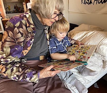 A linguist interpreting the language of pigs reading Richard Scarry with Grandma at home |