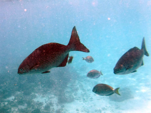 Our fourth outing was at Baby Beach at the far southern end of Aruba. Most of the lagoon was shallow and murky, but by swimming under the Caution cable at the mouth of the lagoon, we found clear water and more interesting fish. But the current coming into the lagoon was strong and it was a struggle to stay in place.